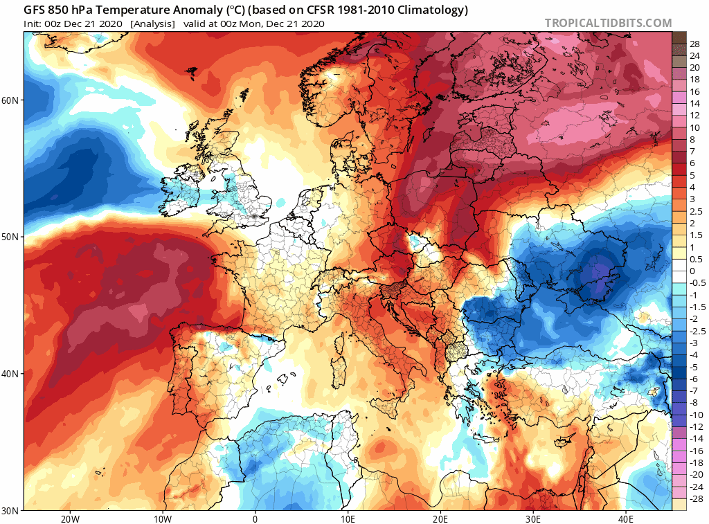 Anomalies thermiques de la masse d'air du lundi 21 au vendredi 25 décembre 2020 - via tropicaltidbits.com