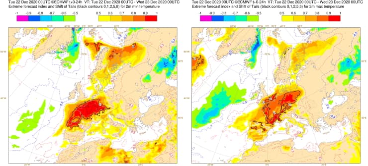 Anomalies des températures minimales (à gauche) et maximales (à droite) ce mercredi 23 décembre 2020 - via ECMWF