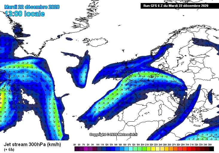 Modélisation du jet stream ce mardi 22 décembre 2020 - modèle GFS via meteociel.fr
