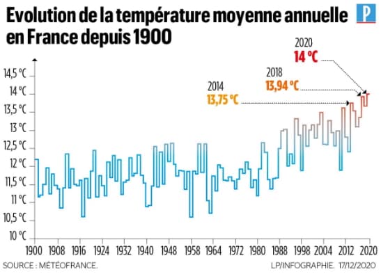 Température moyenne annuelle en France depuis 1900 avec un record en 2020 ! - via Le Parisien