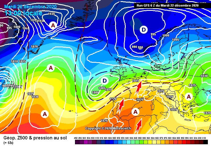Situation à échelle continentale ce mardi 22 décembre 2020 - modèle GFS via meteociel.fr