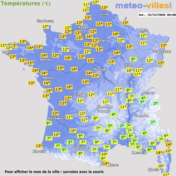 Températures mesurées le mardi 22 décembre 2020 à 8h - Météo Villes