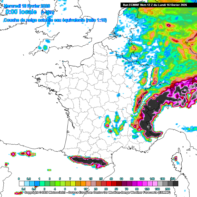 Épaisseurs de neige prévues par le modèle MÉTÉO européen pour mercredi matin - fond de carte Meteociel, retravaillé par Meteo-villes