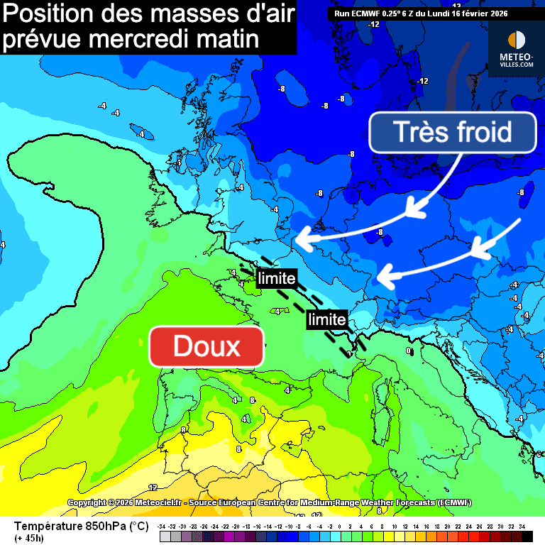 Position des masses d'air à 850 hPa prévues par le modèle MÉTÉO européen pour mercredi matin - fond de carte Meteociel, retravaillé par Meteo-villes
