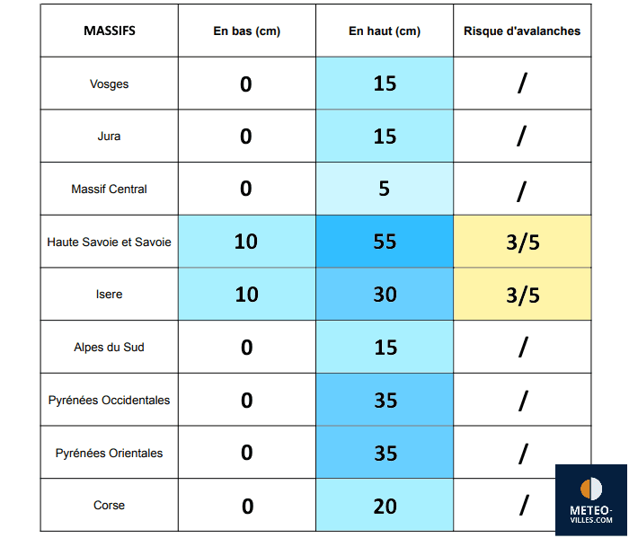 Hauteurs moyennes de neige en bas et en haut des domaines au jeudi 24 novembre 2022 - Météo Villes
