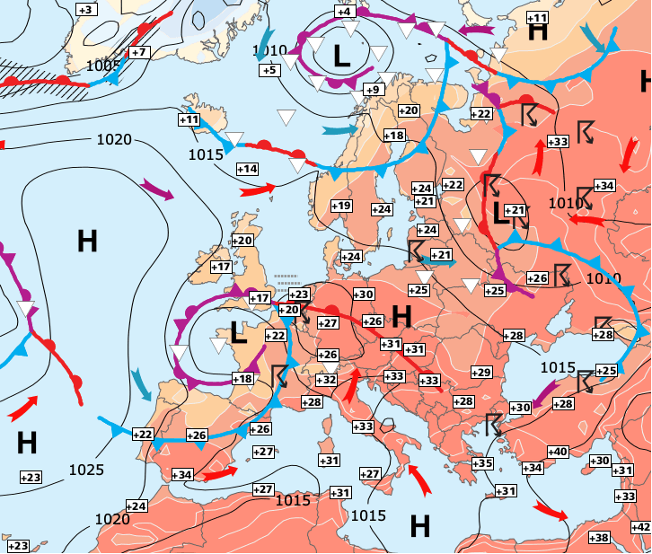 Noms des dépressions et anticyclones prévus pour mardi 29 juin 2021 à midi (Berlin)