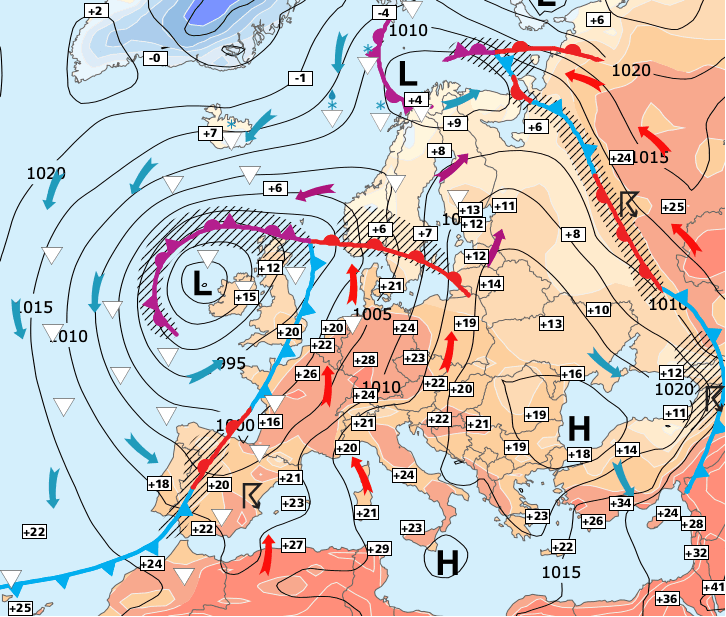 + L'air océanique plus frais est en effet à nos portes et le conflit avec la chaleur provoquera la formation d'une zone d’orages du Pays basque à la Belgique, puis plus à l'est entre dimanche soir et lundi matin.