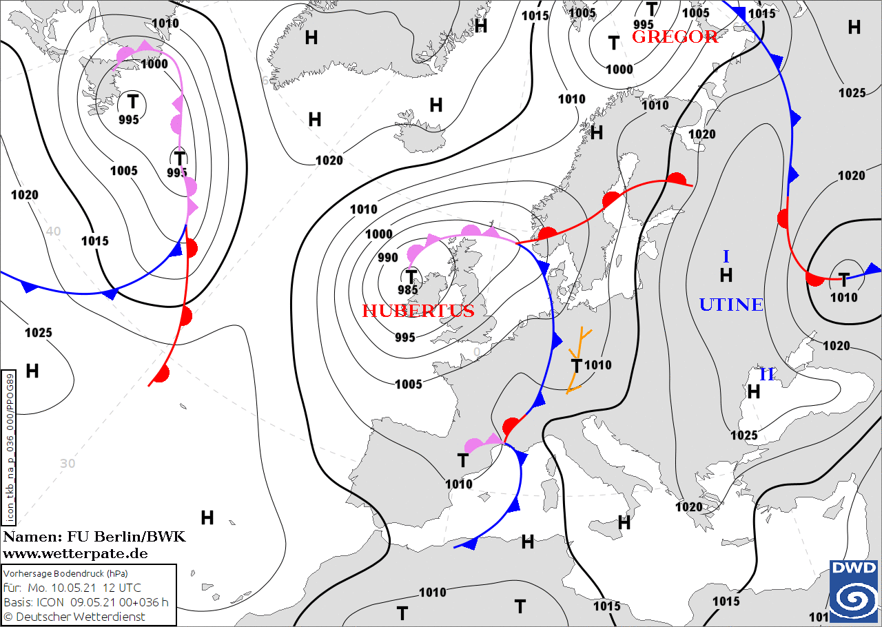Noms des dépressions et anticyclones prévus pour lundi 10 mai 2021 à midi (Berlin)