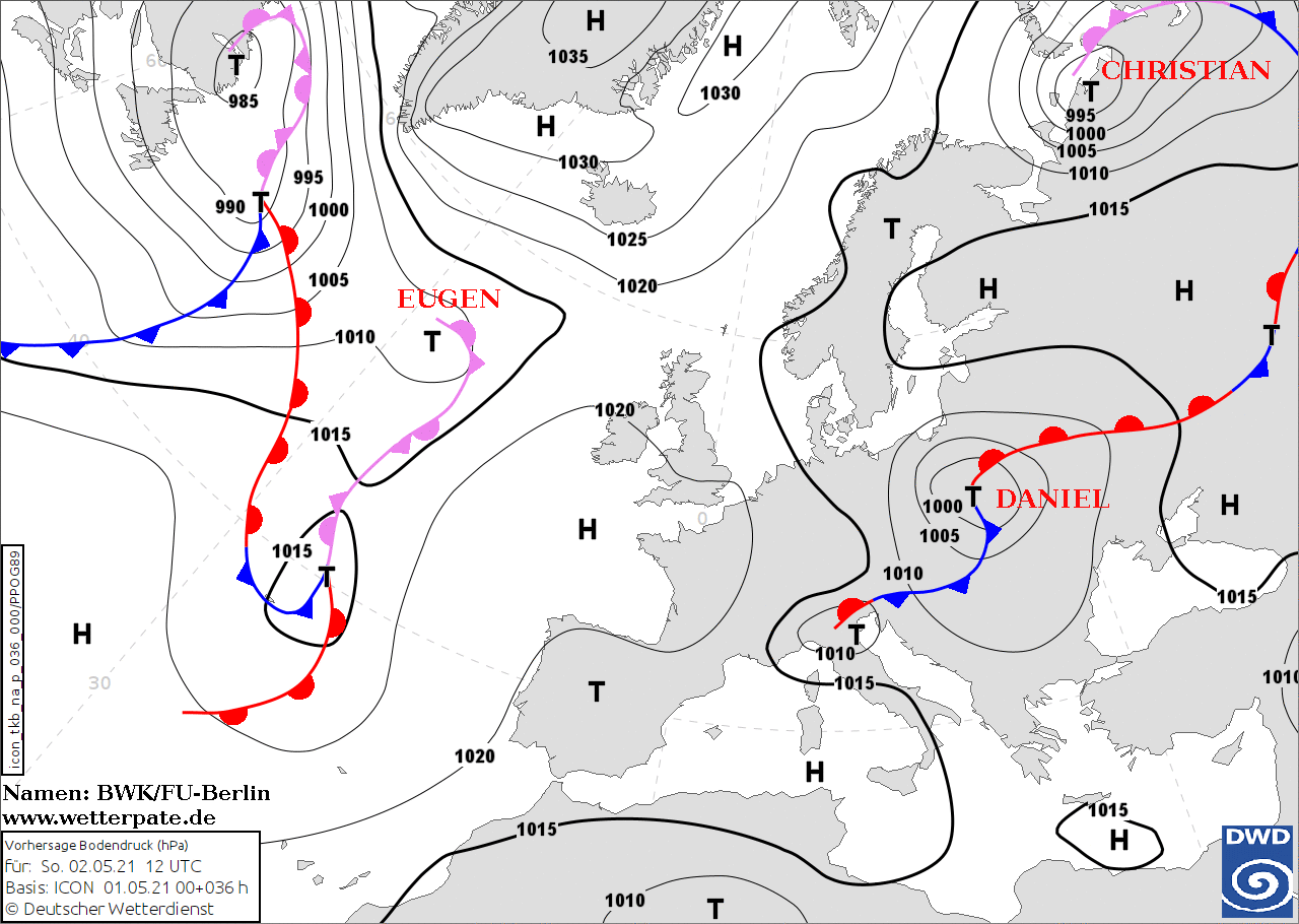 Noms des dépressions et anticyclones prévus pour dimanche 2 mai 2021 à midi (Berlin)