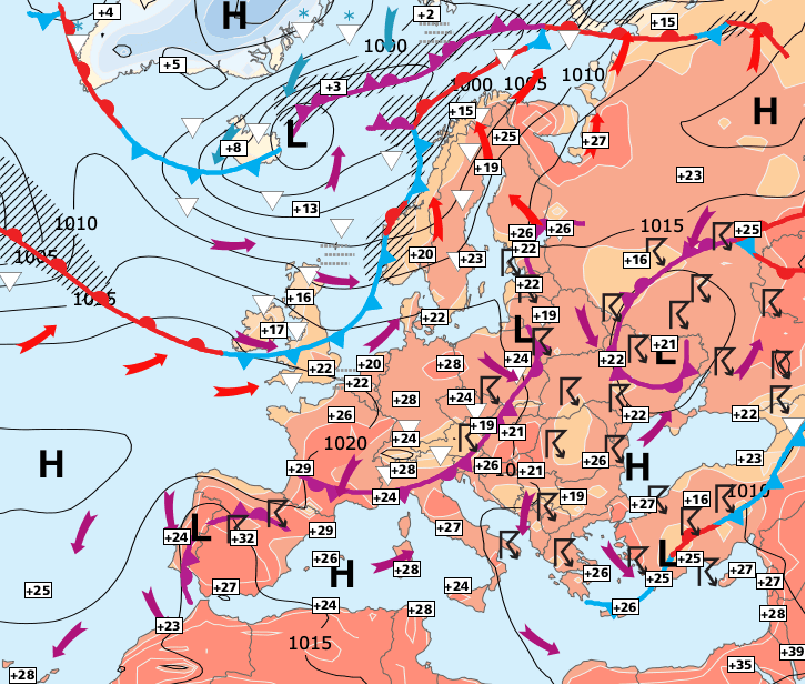 + C’est donc un week-end très estival qui s’annonce car le centre de hautes pressions s’installe entre les îles britanniques et les Pays-Bas.