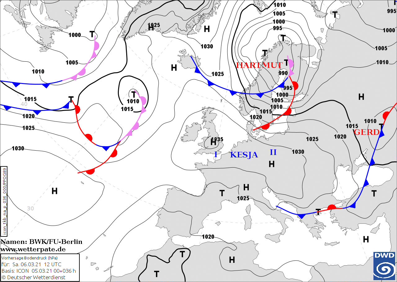 Noms des dépressions et anticyclones prévus pour samedi 6 mars 2021 à midi (Berlin)
