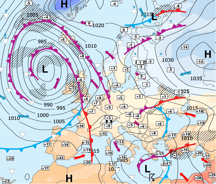 + Nous sommes désormais situés entre l'influence de l'anticyclone d'Europe continentale et d'un vaste système dépressionnaire centré dans les parages des Iles britanniques.