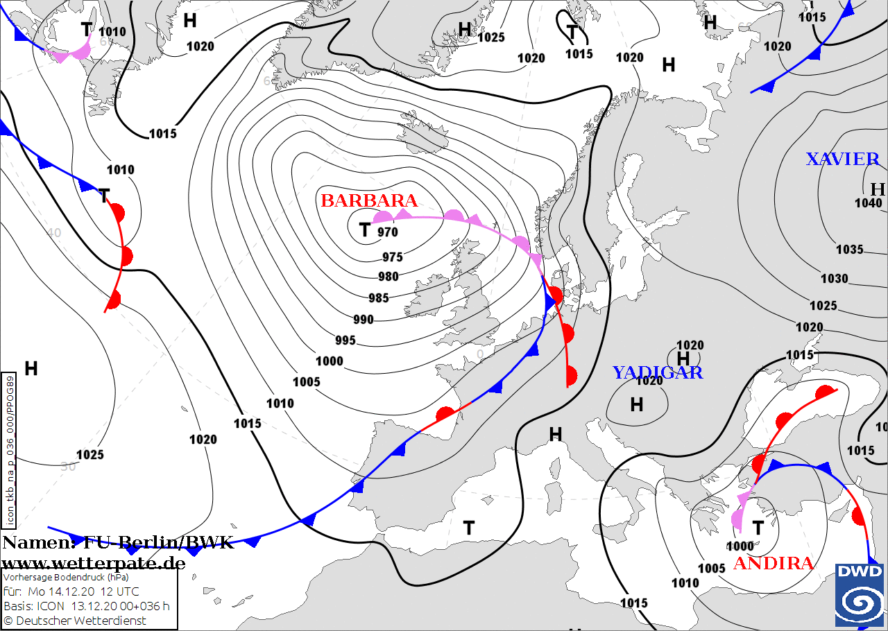 Noms des dépressions et anticyclones prévus pour lundi 14 décembre 2020 à midi (Berlin)