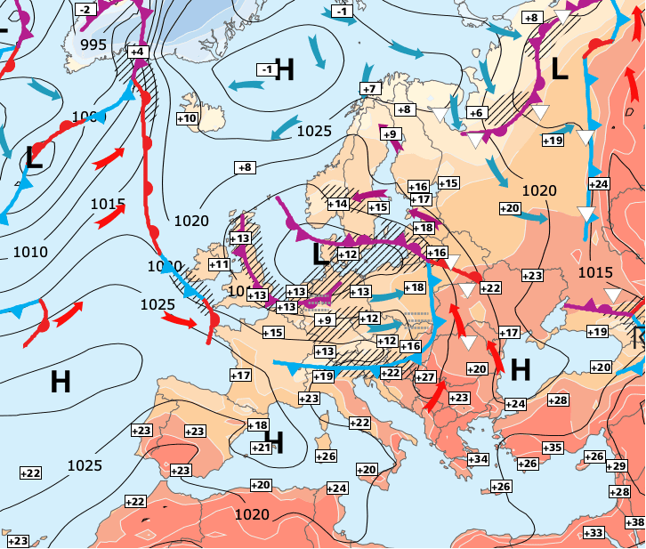 + La fin de la semaine et le week-end prochain seront dominés par un courant continental sec et stable (temps généralement ensoleillé et agréable avec des températures de saison ou un peu au-dessus sur la moitié Sud).