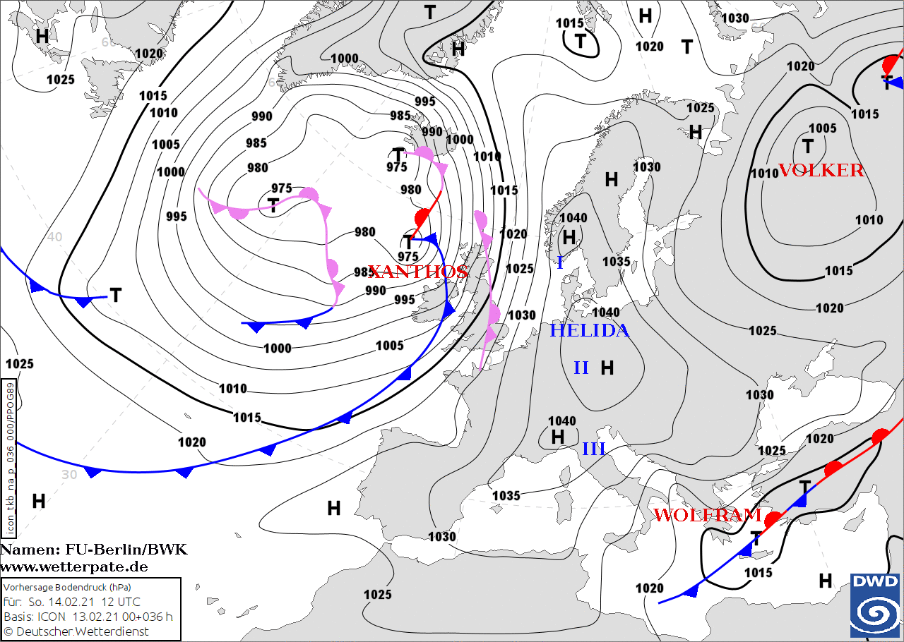 Noms des dépressions et anticyclones prévus pour dimanche 14 février 2021 à midi (Berlin)