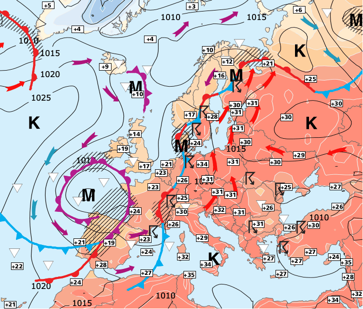 + Le bras de fer entre l'air chaud qui remonte de Méditerranée et l'air plus frais océanique qui arrive en coin se décale vers l'est (raison pour laquelle les orages les plus violents ont principalement éclaté des Pyrénées au Massif-central, à la Bourgogne et à l’Alsace-Lorraine dans la journée de dimanche).