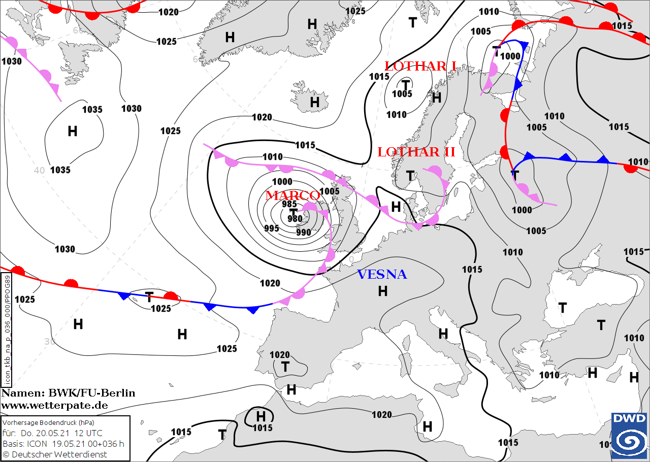 Noms des dépressions et anticyclones prévus pour jeudi 20 mai 2021 à midi (Berlin)