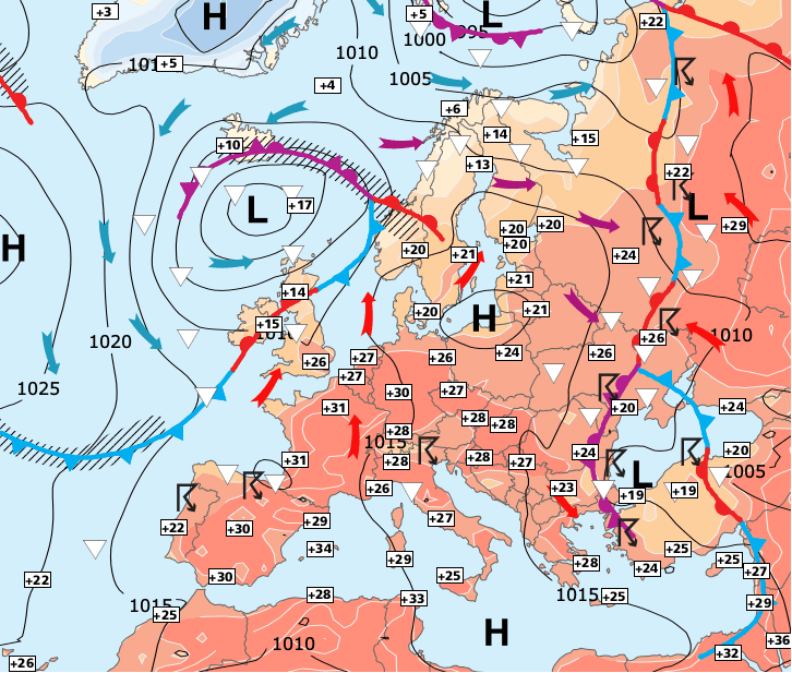 Noms des dépressions et anticyclones prévus pour jeudi 17 juin 2021 à midi (Berlin)