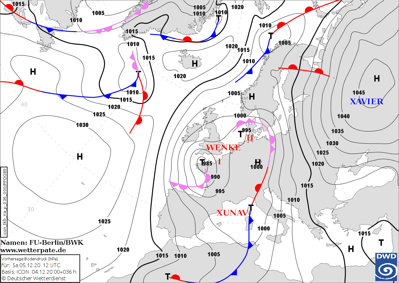 Noms des dépressions et anticyclones prévus pour samedi 5 décembre 2020 à midi (Berlin)