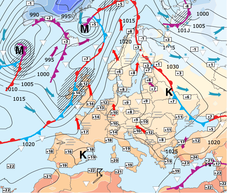 + Les anticyclones restent omniprésents et maintiennent un temps généralement calme et doux (notamment lorsque le centre de ces hautes pressions est situé sur l'Europe centrale).