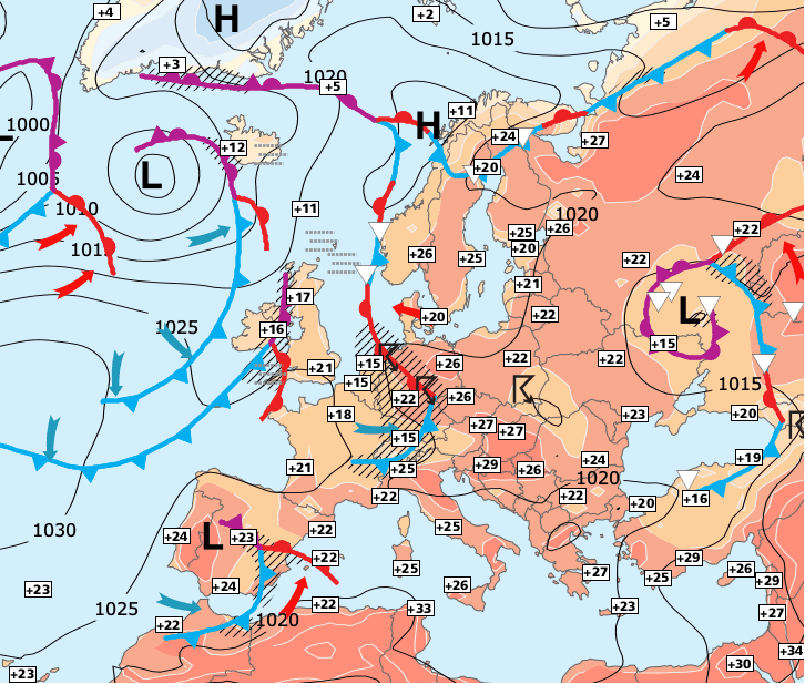 + L’anticyclone des Açores étend son influence vers l’Europe occidentale et chasse la zone d’orages qui nous a concerné durant quelques jours.