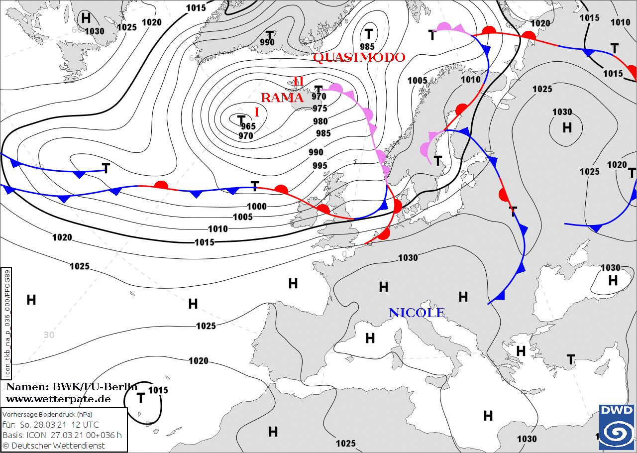 Noms des dépressions et anticyclones prévus pour dimanche 28 mars 2021 à midi (Berlin)