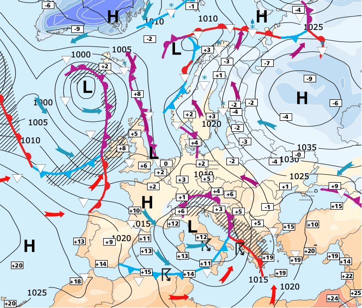 + Changement de régime sur l'Europe occidentale : après plus d’une semaine où nous avons été influencés par une descente froide en provenance de Scandinavie, le courant bascule à l’ouest avec une remontée des températures en allant vers l'Atlantique.