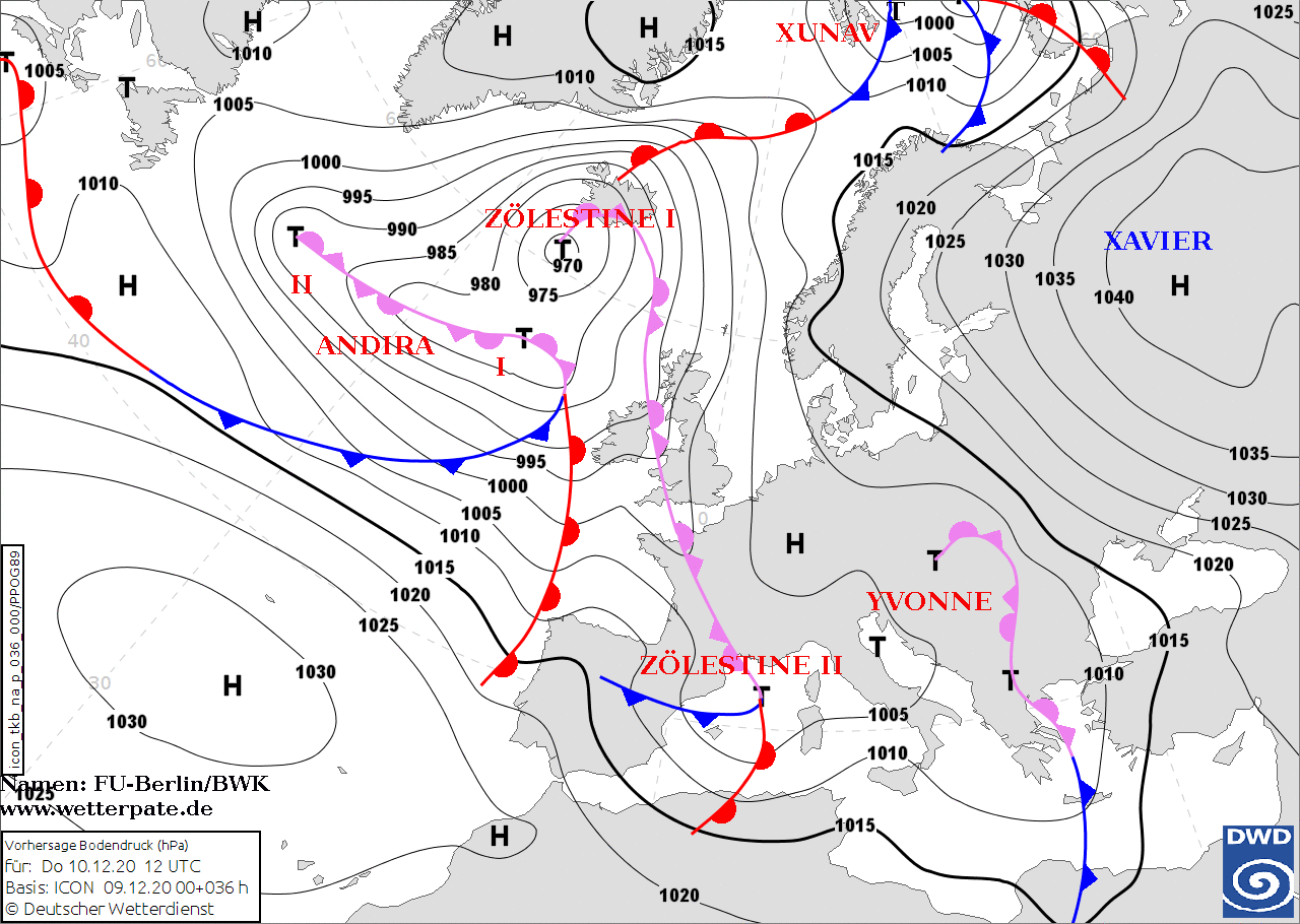 Noms des dépressions et anticyclones prévus pour jeudi 10 décembre 2020 à midi (Berlin)