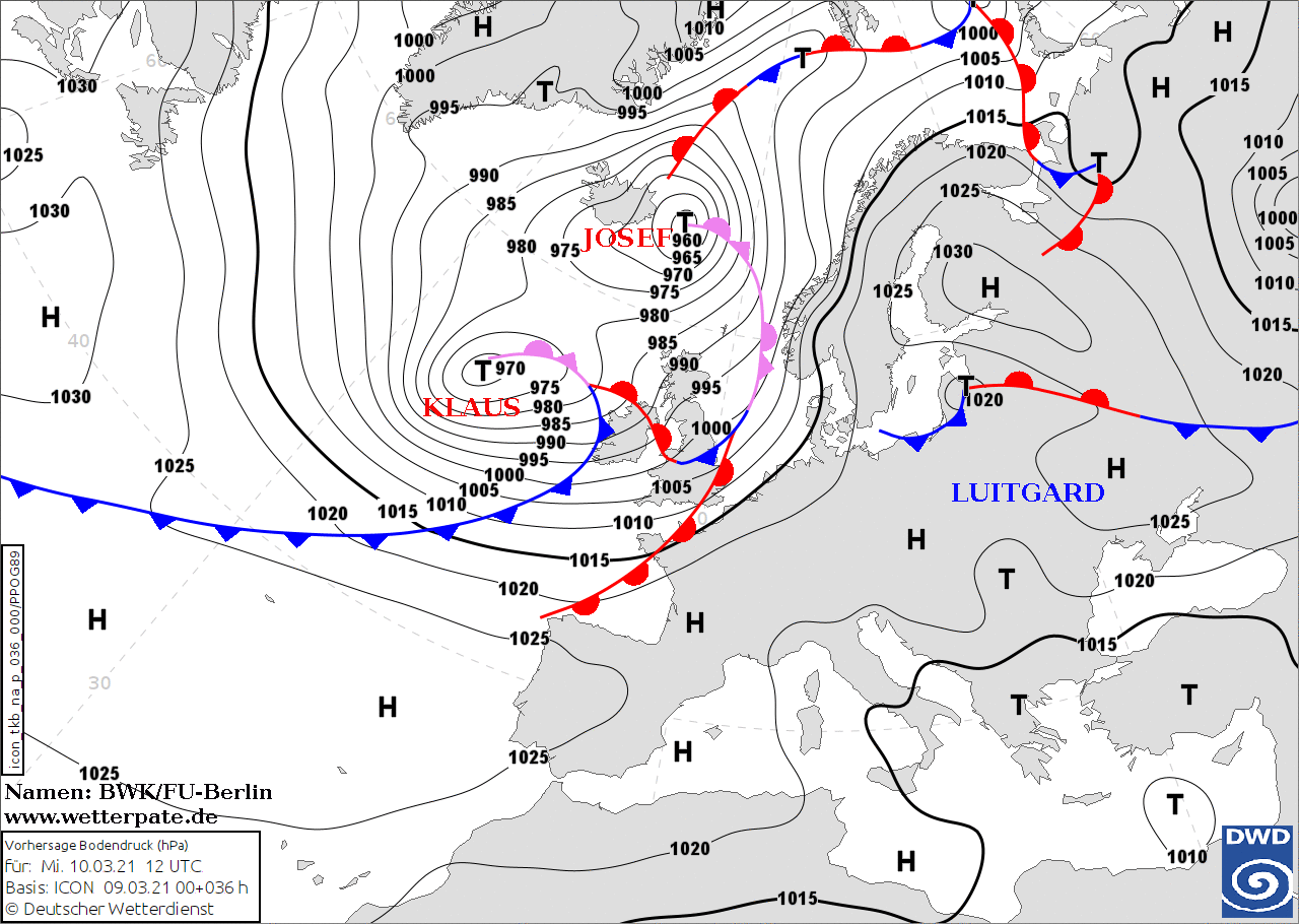 Noms des dépressions et anticyclones prévus pour mercredi 10 mars 2021 à midi (Berlin)