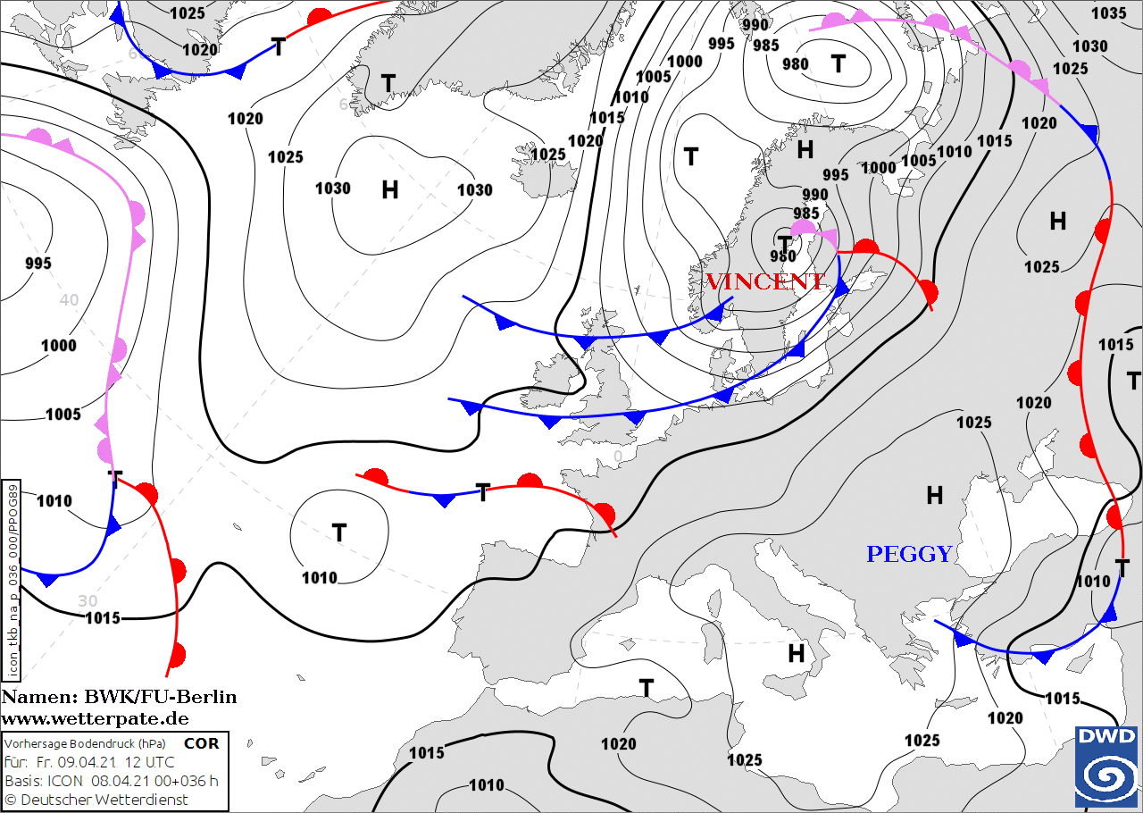 Noms des dépressions et anticyclones prévus pour samedi 10 avril 2021 à midi (Berlin)