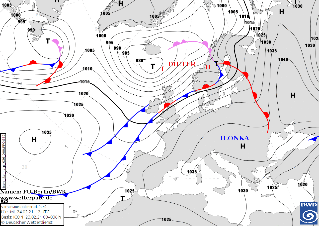 Noms des dépressions et anticyclones prévus pour mercredi 24 février 2021 à midi (Berlin)