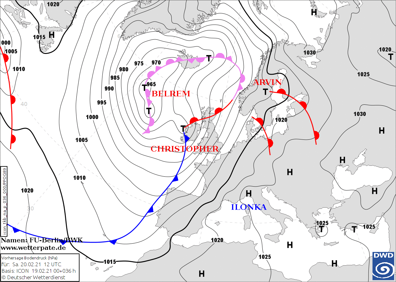 Noms des dépressions et anticyclones prévus pour samedi 20 février 2021 à midi (Berlin)