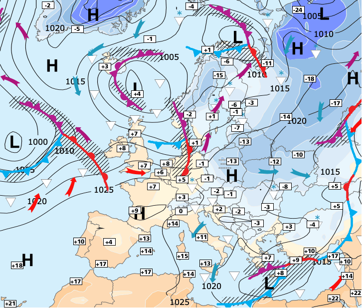 + L’anticyclone qui s’est temporairement installé sur la France se décale vers le sud de la Méditerranée.