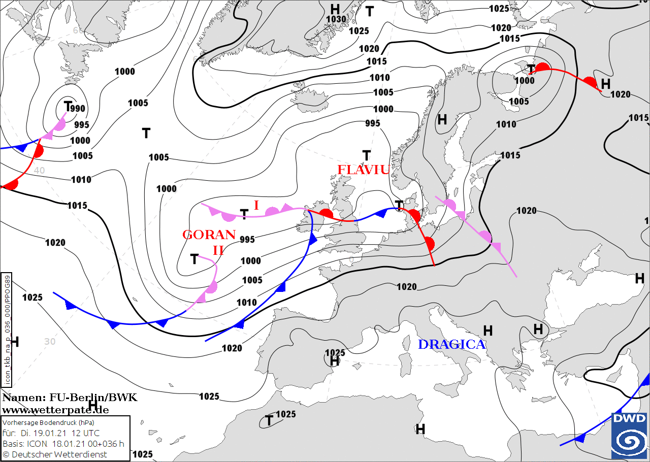 Noms des dépressions et anticyclones prévus pour mardi 19 janvier 2021 à midi (Berlin)