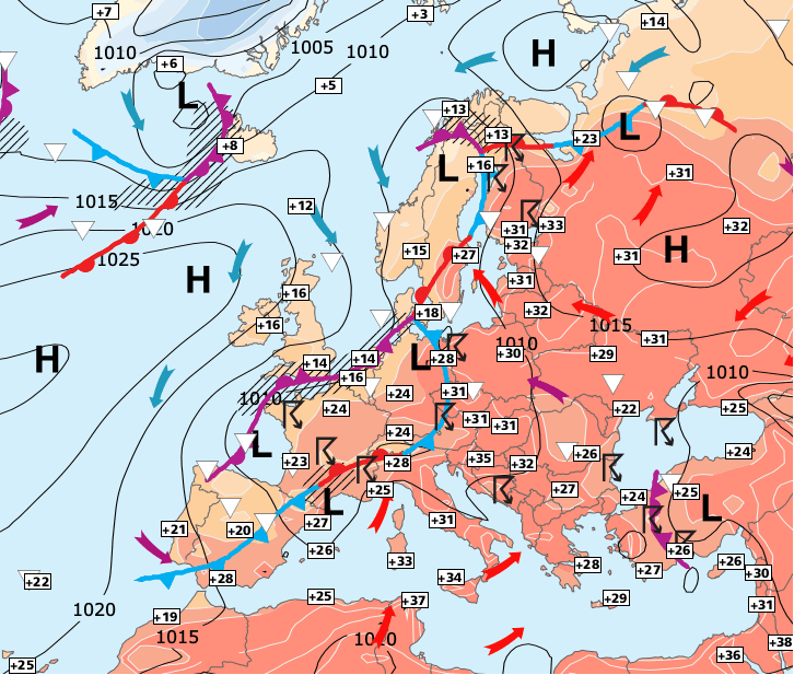 Noms des dépressions et anticyclones prévus pour mardi 22 juin 2021 à midi (Berlin)