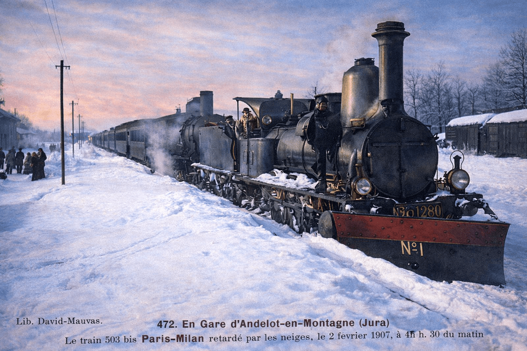 Le train Paris-Milan bloqué par la neige dans le Jura le 2 février 1907